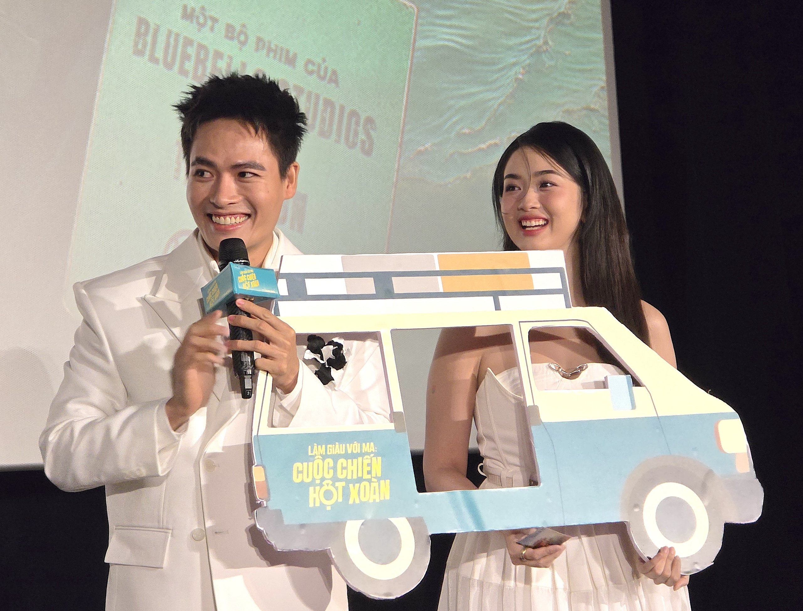 Chiều 31-7, phim Làm giàu với ma 2: Cuộc chiến hột xoàn tổ chức giới thiệu phim tại TP.HCM. Đạo diễn Trung Lùn cùng dàn diễn viên gồm Tuấn Trần, Diệp Bảo Ngọc, Võ Tấn Phát và Ngọc Xuân tham dự.